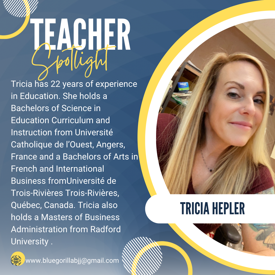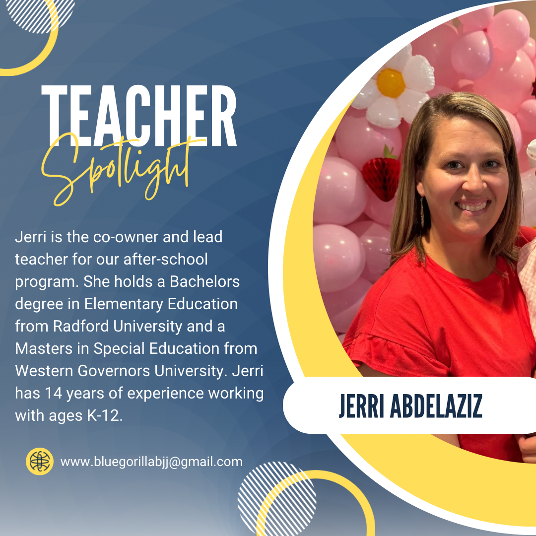 Jerri is the co-owner of Blue Gorilla Brazilian Jiu-Jitsu and Lead Teacher for our afterschool program. She has a Bachelor of Arts Degree in Elementary Education from Radford University, and a Master of Science Degree in Special Education from Western Governor’s University. Jerri has worked in education (K-12) for 14 years.