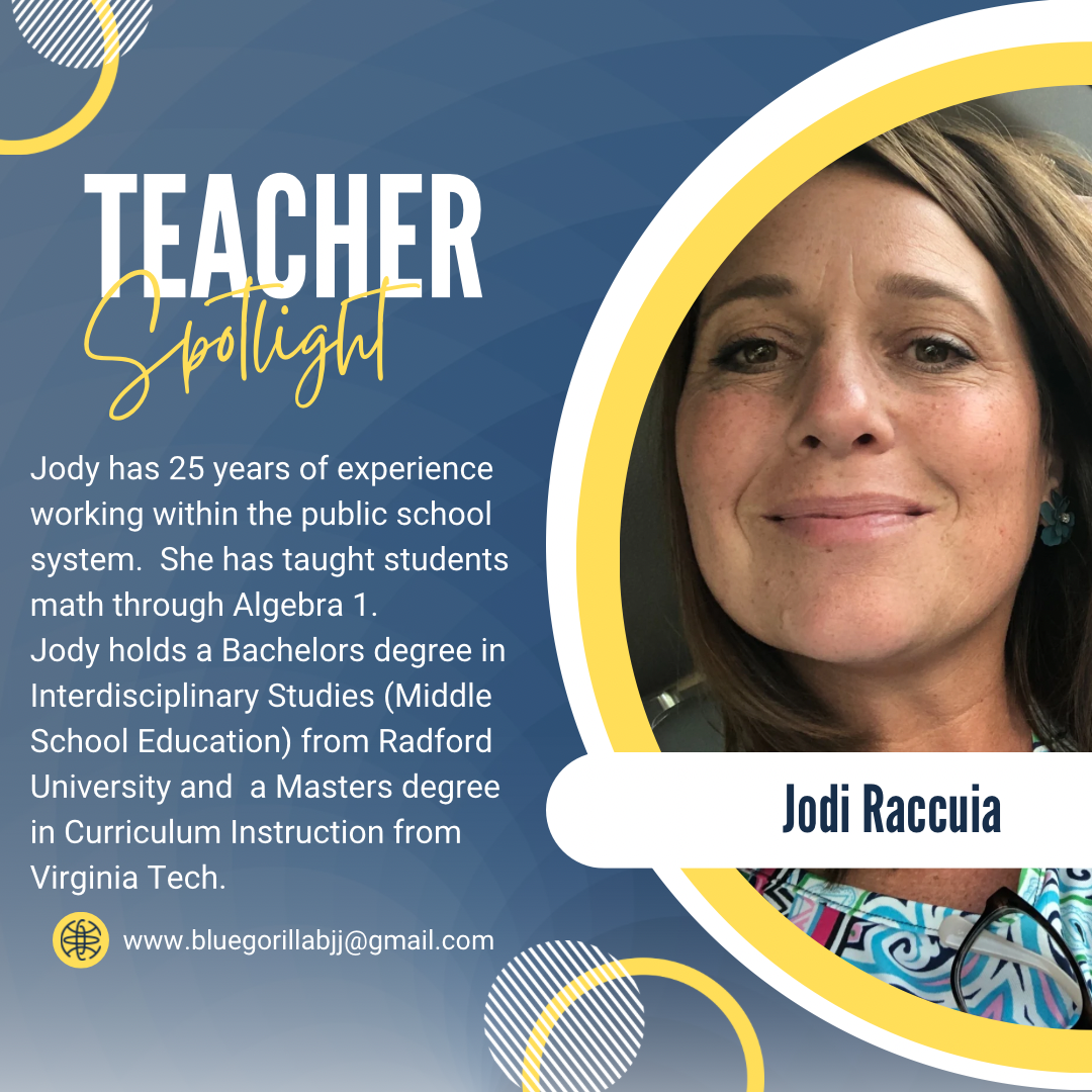 Jodi has 25 years of experience working within the public school system. She has taught math up through Algebra I. Jodi holds a Bachelor of Arts Degree in Interdisciplinary Studies (Middle School Education) from Radford University and a Master of Arts Degree in Curriculum Instruction from Virginia Tech.